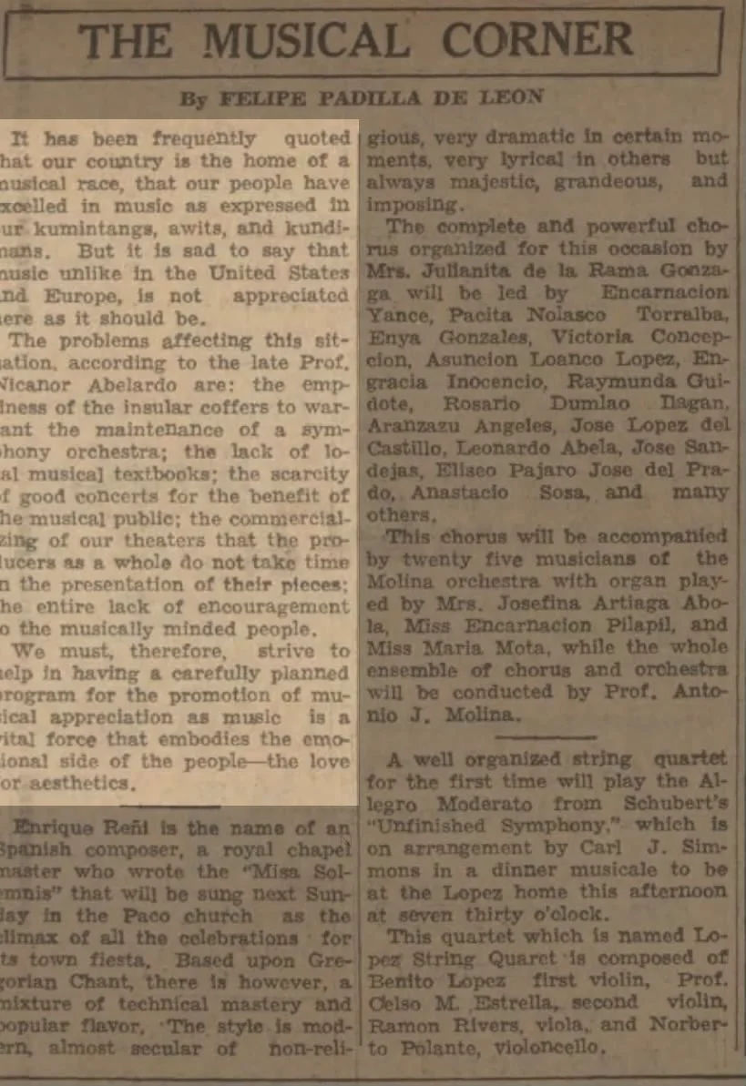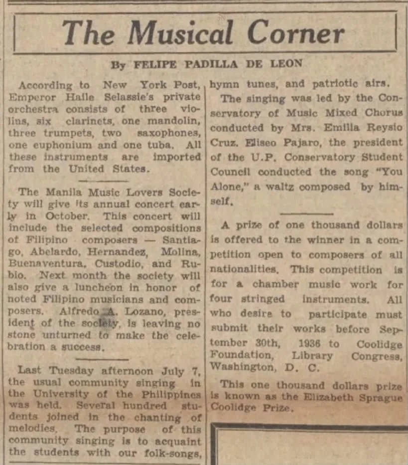 It should be noted that the composers most often recognized for formulating a national music identity (Francisco Santiago, Nicanor Abelardo, Antonino Buenaventura, and later Pajaro and Lucrecia Kasilag) were all graduates and faculty members of the UP Conservatory. Who, then, decided what “nationalist music” was? Was it the people, or the University of the Philippines? Was the hybrid of Western and indigenous music popular among the majority of Filipinos, or only those trained at the Conservatory? Answers to these questions are beyond the scope of this article, however, I mention these questions to be mindful of the histories that are told about Filipino music. One university tells the narrative of American-colonial Filipino music, even though they were far from being the only site for music making.