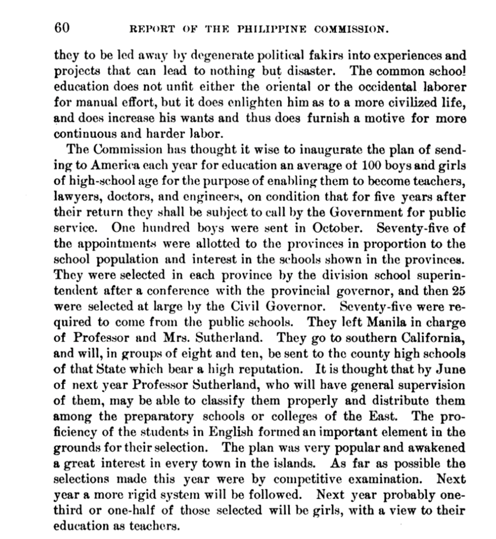 The American government also established the Pensionado Act in 1903, which allowed Filipinos to pursue higher education in the United States, under the condition that they would return to the Philippines immediately after graduation to become civil servants. As more Filipinos were being educated abroad, the desire for a national identity, apart from the Americans, increased. The arts and humanities proved to be a valuable tool for this endeavor. The University of the Philippines formed an “oriental languages” department in 1924 as interest in Filipino regional languages grew. UP Conservatory professor Francisca Reyes traveled throughout the Philippines to record regional folk dances, eventually leading to their popularity in Manila and the establishment of a canon of national dances. When composer and pianist Francisco Santiago performed one of his own works at a solo recital in Chicago in 1924, he stated that his reasons for doing so were that “Filipino above all, I thought I should do my part [for] propaganda for our country. I wanted the American public to perceive that we are not savages.” Later, Santiago became the first Filipino director of the UP Conservatory and encouraged the study of indigenous Filipino music at the institution.